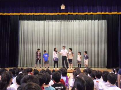 校庭が使用できないため、体育館で全校朝会を行いました。はじめに、6月15日(水)から二泊三日で川場移動教室に行く5年生に校長がインタビューしました。「川場村は群馬県にあります。」「1日目は、勤労体験学習としてさつまいもの苗を植えたり、夕食は飯ごう炊さんでカレーを作ったり、ナイトハイクをしたりします。」「鱒づかみの体験とカレーづくりが楽しみです」等、答えていました。