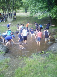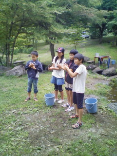 鱒づかみ体験は、くじ引きで取る順番を決めました。水の冷たさと魚のぬるぬるさと戦いながら、必死に取り組んでいました。