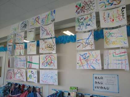 1年生の教室前の廊下には、図画工作の時間の作品が並んでいます。テーマは、「せんのかんじ いいかんじ」です。初めて使った絵の具。絵筆を使って思い思いの線をかきました。パレットの使い方、絵の具の出し方、水への溶き方、絵筆の持ち方や画用紙への置き方…。たくさんのことを学びながら、自分だけの「せんのかんじ」ができあがりました。できあたった作品を見て、みんなで「いいかんじ」を味わいました。