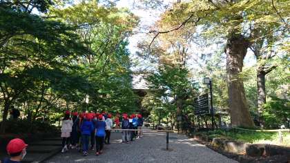 次に訪れたのは、九品仏浄真寺です。紅葉が始まったお寺の境内で秋を感じながら、世田谷区の区花が「さぎそう」であること、境内一体が400年前には奥沢城というお城であったこと、九品仏の意味などについて学びました。