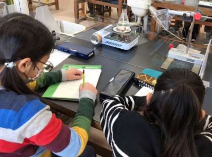水が沸騰しているときに出ている「泡」に着目し、この気体が空気なのか水蒸気なのか予想しながら実験をしました。沸騰するまで水を熱し、出てきた気体を袋に集めて観察してみると、たくさんの気付きが挙がります。「袋が膨らんでくもった!」「フラスコの内側にも水滴があるね」「袋が膨らんだ後、冷えてくると袋に水滴がたまっていたよ」安全に実験し、よく観察できました。話し合いの結果、泡の正体は「○○」だと結論付きました。みなさんはどう思いますか?