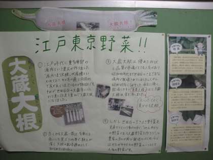 栄養士と給食室の調理員さんが協力して、給食のメニューや調理の方法を工夫しています。先日は、世田谷区の地元の野菜「大蔵大根」を使ったメニューが登場しました。この「大蔵大根」。以前は、世田谷区の大蔵地区を中心にたくさんつくられ、出荷されていたようです。今、よく見かける「青首大根」が流通する前には、たくさんの人に親しまれた地元の野菜でした。栄養士と調理員、スクールサポートスタッフの皆さんが協力して、この「大蔵大根」を紹介する資料をつくり、給食室前に掲示しました。給食で、この「大蔵大根」を使った日には、栄養士が、青首大根と大蔵大根の両方を持って、各教室を回り、子どもたちに紹介しました。