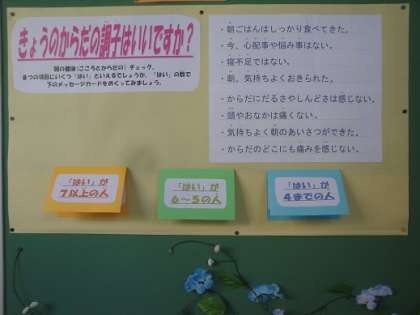 保健室の前の掲示板には、子どもたちが、自分自身の健康や安全について考える機会となるよう工夫した手作り教材を、年間を通して掲示しています。現在は、「きょうのかだらの調子は いいですか?」と題して、子どもたちが、自分自身の健康チェックができる教材を掲示しています。
