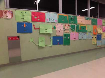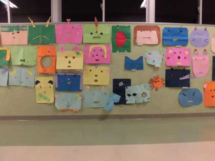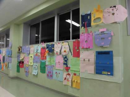 1年生の図画工作の作品です。「ひらめきコーナー」という単元で、紙に穴をあけてお面を作りました。