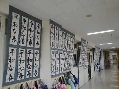 国語の時間に、全校で「書き初め」に取り組みました。1・2年生は硬筆(写真左)、3年生からは毛筆(写真中央)です。例年は、3学期の学校公開期間に合わせて展示をしていましたが、コロナ禍にある今年度は、児童が相互に鑑賞し合う形式での「校内書き初め展」としています。昨日も、1年生が、2年生から6年生までの作品を見て、文字の大きさや美しさに驚きの声を漏らしていました。1年生から6年の作品(写真右)を順々に見ていくと、子どもたちの確実な成長を見ることができます。小学校という6年間の学校生活の中で、子どもたちができることが増え、できばえも変化していくことを実感します。保護者の皆さまにご覧いただけないことが残念ですが、本校では、別途、ご案内のとおり、2月中旬からの学校公開を予定しています。今後、新型コロナウイルス感染症の感染拡大の状況を注視して、状況に応じた実施方法を検討して行きたいと思っています。
