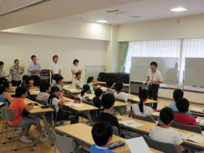 多目的室に区内の先生方が120名ほど集まり、熱心に参観していました。子どもたちは、たくさんの参観者に緊張している素振りも見せず、一生懸命に学習に取り組んでいました。