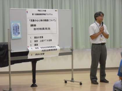 今年度一回目の家庭教育学級は、吉村実校長を講師に「児童の心と体の発達について」講演会を行いしまた。世田谷区教育委員会 生涯学習地域学校連携課の社会教育指導員の内田隆夫先生も講演を聞かれました。100名を超える方をご参会され、「子供たちの発達は年齢によって違うので、その状況をふまえた声かけが大切である」「年齢にあわせた運動のさせ方」「様々なことを体験させ、見守ることで、思考力や判断力が培われていく」等、多岐にわたる内容の講演でした。準備をしてくださった文化厚生委員の皆様、参会してくださった皆様、ご多用の中、また暑い中ありがとうございました。
