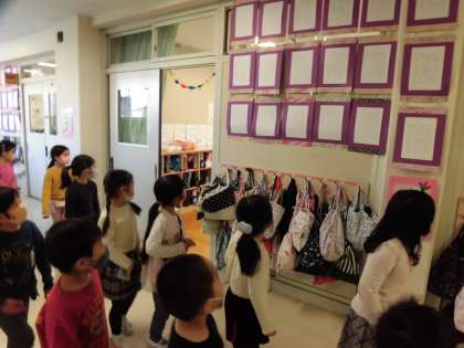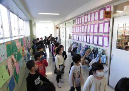 1月に開催していた書き初め展。子どもたちは各クラスごとに校内を歩き、全学年の書き初めを鑑賞する時間を取りました。