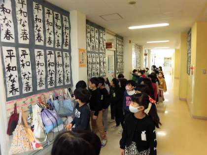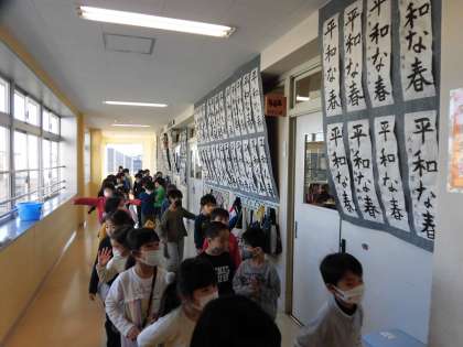 最後に6年生。小学校生活最後の書き初めです。年初めに今年1年の目標を願いながら書く書き初め。中学校に進んでも、「平和」な心を忘れずに、さらなる飛躍を願っています。