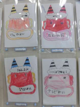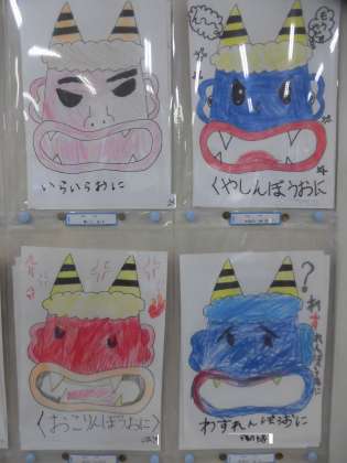 まずは担任が、節分の行事について説明をしました。その後、鬼の顔が書かれた絵を渡して、自分の心の中に住んでいる鬼を描きました。「おこりんぼ鬼」や「わすれんぼ鬼」、「なまけ鬼」など、自分の直したいところを考え、鬼の名前にしました。