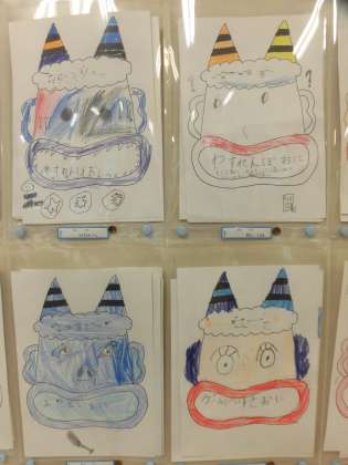 授業の最後には、出来上がった鬼の顔を学習ポケットに入れて、全員で豆を投げるふりをして、心に住んでいる鬼を追い出しました。季節の行事について、楽しく学ぶことができました。