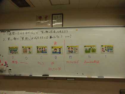 買い物の手順をふり返り、「契約」の瞬間だと思う場面を考えました。どのクラスでも「お金を払ったとき」や「商品を受け取ったとき」と考える児童がほとんどでした。正解は「お客さんが「これください」と言い、お店の人が「かしこまりました」といった瞬間」です。「消費者の申し出後、店の承諾の瞬間が「契約」である」ことは、大人もはっきり認識できていないことかもしれません。