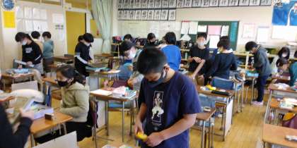 知識を得たら、家庭科では実践することが大切です。道具箱を「整理整頓」しました。「算数ブロック」やプリント類、友達からもらった折り紙など出てきます。それらは、「5年生の道具箱」に必要なのかを見極めます。整理が終わったら、よく使うものは手前に置く・仕切りをする等「整頓」を行います。