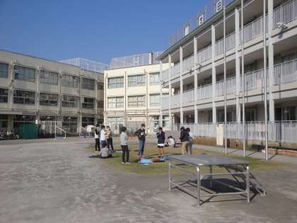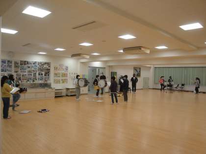 例年であれば、楽器や役割ごとに6年生と5年生がペアをつくり、時間をかけて演奏の仕方や動き方、演奏や動きのポイントなどを伝えていきます。コロナ禍の今年度は、密を避ける観点から、教室内での練習を十分に行うことができません。そこで、校庭や多目的室、体育館などに分散して、広くて換気のよい空間で、6年生から5年生への伝授に取り組んでいます。