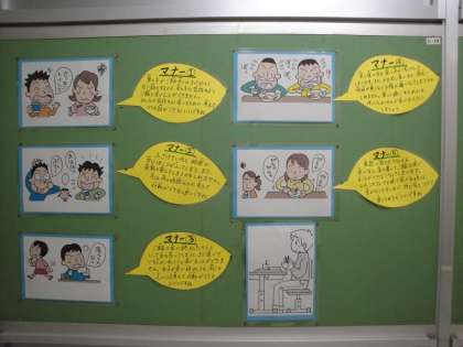 「食事のマナーを知っていますか?マナーを守って食事をしていますか?」と給食委員会のみなさんが、給食の時間の放送を利用して、「マナーの紹介」をしました。写真の掲示は、栄養士が作成した「食事のマナーに関する資料」です。。これを基に、1日に1つずつ紹介していきました。マナーを守ることは、コロナ禍での安全対策にもつながることに気付きました。