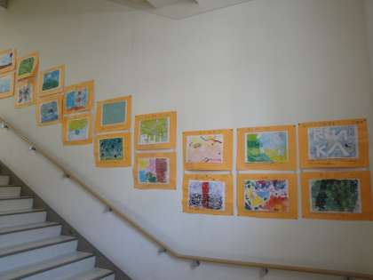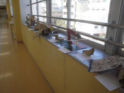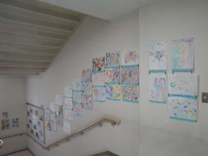 これまでにもご紹介してきたとおり、赤堤小学校は、「学校全体をギャラリーに…」との考えから、子どもたちが図工の授業で作った作品を、廊下や階段などに展示しています。階段を飾る3年生や6年生の絵画。廊下には、5年生が段ボールで作った「想像の鳥たち」が並んでいます。立ち止まって友達の作品を見たり、上や下の学年の作品を見ることで、子どもたちの創作意欲が高まったり、お互いの作品や表現のよさを認め合ったりすることが、日常生活の中で行われるように、工夫しています。