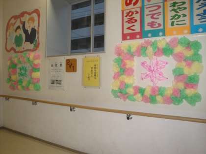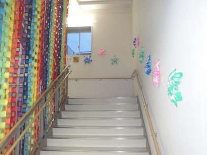 第1部の舞台となる校舎の中は、既に、装飾でいっぱいです。1年生が6年生の教室前に掲示した感謝の言葉(写真左)。階段には、3年生が作った輪飾りと4年生が作った星形の装飾(写真中央)。踊り場には、2年生が作った花の装飾(写真右)が飾られています。5年生は、6年生にわたす色紙をつくっています。