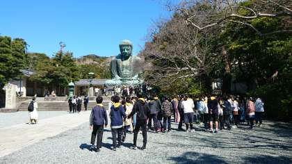 高徳院の見学です。鎌倉の大仏さまが、青い空に映えています。大仏の鋳造方法や、完成までの歴史、津波によって大仏殿が流されたことなどについて学びました。子どもたちは、歴史を感じながら、大きな大仏さまを見上げていました。