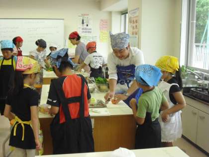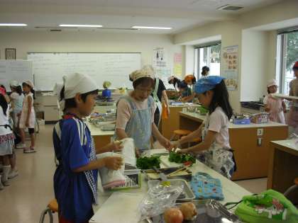 栄養のバランスを考えた朝食をグループで作っています。低学年の児童も、同じ班のお兄さん、お姉さんと一緒に、野菜を洗ったり、皮をむいたり、切ったりして真剣なまなざしで作っています。メニューは、フレンチトースト、コンソメスープ、ほうれん草のソテー、ツナ入りポテトのマヨネーズあえ、ヨーグルトです。参加希望の多かった「朝ごはんを作ろう」は、7月25日(月)にも行いました。8月1日(月)にも行う予定です。地域の皆様、保護者の皆様お手伝いありがとうございます。