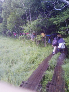 雨がひどくなってきたので、昼食後予定を変更して、全体で湯滝から赤沼まで歩くことにしました。子どもたちは、文句を言いながらも、雨の中をよく歩きました。