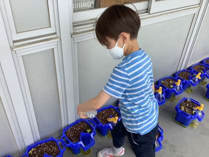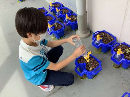 1年生の生活科の学習です。ゴールデンウィーク明けからアサガオを栽培し始めました。