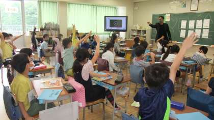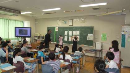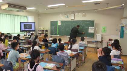 外国語活動が始まり、ALTの先生とも授業を通して楽しくコミュニケーションをとれるようになってきました。本日は、色々な形を英語で発音する活動をしました。形について単語の発音を学んだあと、発音を聞いて形を当てるクイズをしました。発音する役、形を指差して当てる役と、役割を分けてクイズをし、上手に発音したり聞き取ったりすることができました。