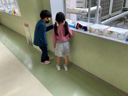 さっそく2年生が中をのぞき込んで「わあ!すごい!」「中に犬がいるよ!」「ここからも中がのぞけるみたい!」と楽しそうに鑑賞タイム。