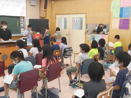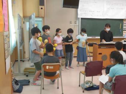 4年生の音楽では、いろいろなリズムを使って学習をしています。今回は、ラテンの楽器(クラベス・マラカス・ギロ)を使って学習します。演奏する曲は「いろんな木の実」です。ラテンの楽しい音楽と楽器を合わせます。授業では、各代表のグループが前に出てリズムや歌を演奏します。4年生のこどもたちは、足でリズムを取りながら、身体全体を使って演奏しています。楽しいリズムの音楽が音楽室いっぱいに広がります。