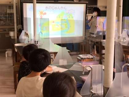 下水道を管理している方々をゲストティーチャーに招き、使った後の水をどのように処理していくのかを学びました。クイズや実際の動画、実験を通して、「うちも油は固めてごみに出しているよ!」「ティッシュを流すと詰まってしまうから、トイレットペーパーを使うんだね。」と生活を振り返る姿が見られました。