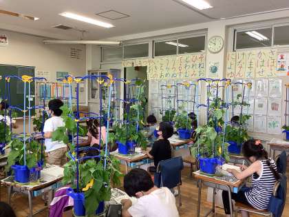 1年生の生活科です。アサガオの種をまいてから1か月経ち、つるが長く成長してきました。「隣の子と絡まっているよ!」と報告に来てくれる子もいました。