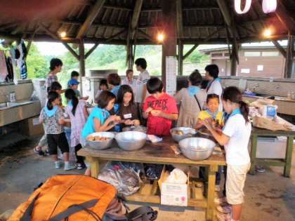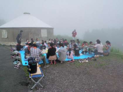 写真は、夕食作り、霧の中の夕食の様子です。カレーライスを作り、おいしく食べました。宿泊は「パオ」(2枚目の写真の後ろ)に、寝袋で寝ました。熱帯夜の東京とは別世界で、ぐっすり寝ることができました。