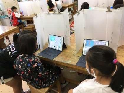 出された課題の動きがうまくいかない時はお互いにアドバイスしあって、思い思いの水族館をつくります。
