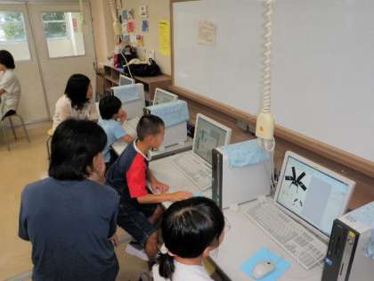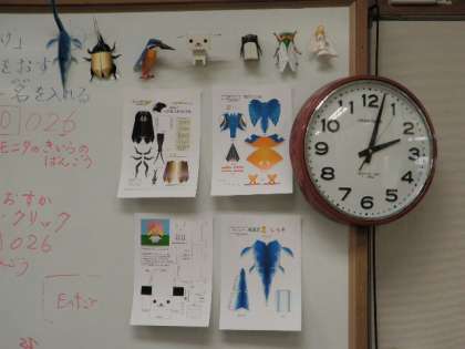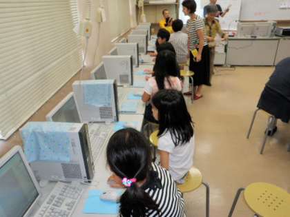 まずはじめに、「ぬりえ」をしながら、マウスの動かし方、色の塗り方、スタンプの使い方を勉強しました。次に、今日のおみやげ「ペーパークラフト」にスタンプで名前を入れ印刷しました。そして最後に、「おえかき」のやり方を教えていただき、でき上がった絵を印刷して終わりました。