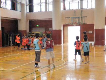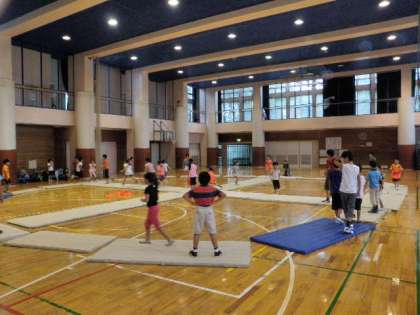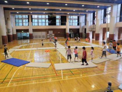 今日も雨のため、体育館で行いました。今日の参加者は32名。昨日のリピーターも多くいました。今日の遊びはまず「円十(まるじゅう)」という遊びをしました。実際には校庭で円の中に十の字を書いて遊びますが、校庭が使えないので体育館にマットを敷いて遊びました。円と十の中を鬼に捕まらないように逃げます。鬼にタッチされたら、靴を片方脱いで中心に置き逃げます。靴を取り返せないうちに捕まると鬼になります。