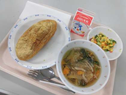今日は、子どもたちが大好きな「きなこあげパン」です。