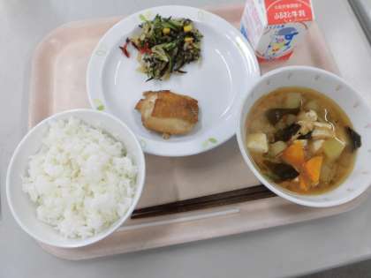 献立:ごはん、鶏肉の照り焼き、大根とひじきのサラダ、冬瓜のみそ汁