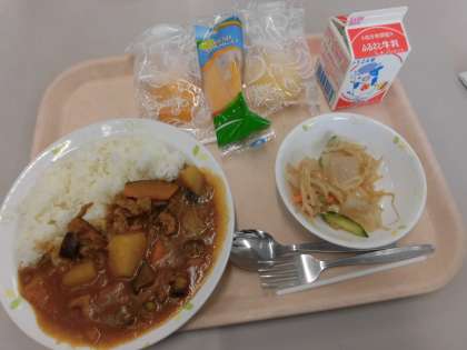 献立:夏野菜カレーライス、こんにゃくサラダ、セレクトフルーツ