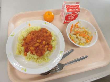 チリビーンズライス、コーンサラダ、くだもの(冷凍みかん)