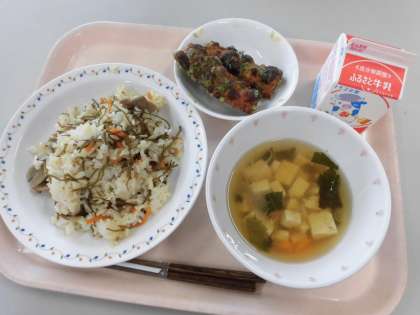 豚肉とごぼうのごはん、ちくわの磯辺揚げ、すまし汁、牛乳