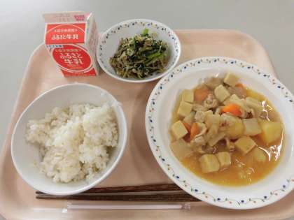 麦ごはん、肉じゃがうま煮、こまつの海苔あえ