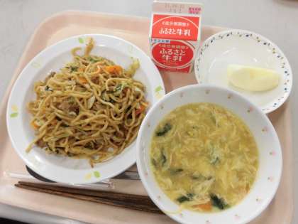 ソース焼きそば、中華風コーンスープ、くだもの(りんご)