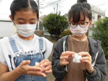 夏に黄色→ピンクのきれいな花をつけた綿のコットンボールが次々はじけてきました。休み時間に収穫の第一弾を行いました。ふんわりした綿の中に種が入っています。まだ花をつけているものもあるので、このあとも収穫を味わえそうです。