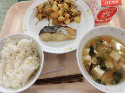 麦ごはん、魚の西京焼き、刻み昆布の五目煮、吉野汁