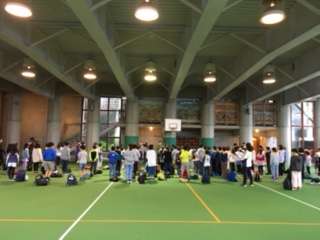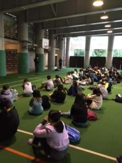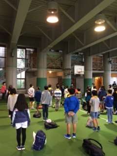 開室式をしています。お世話になるビレジの職員の方のお話を聞き、代表の子供の挨拶も立派にできました。子供たちの態度が素晴らしいです。