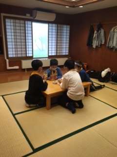 部屋でくつろいでいます。プログラムの合間に友達と遊んだり休んだりしています。楽しそう。
