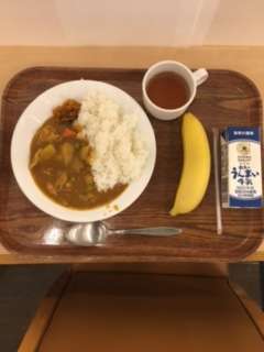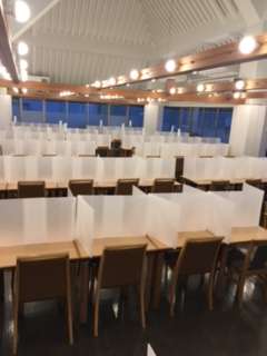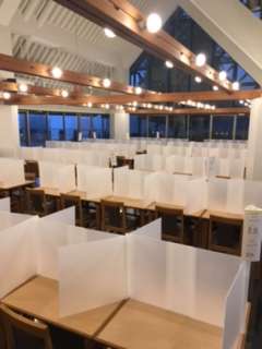 夕食の支度ができました。献立はカレーです。食堂のテーブルに個別のパーテーションを設置してあります。