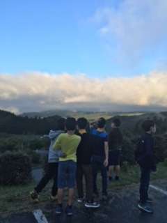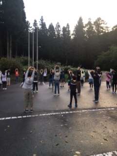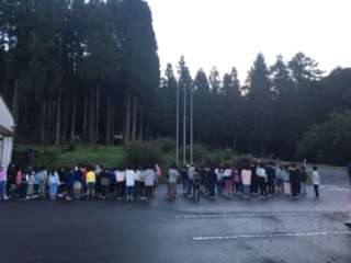二日目の朝。雨も上がり、昨日まで霧の中で見えなかった周囲の景色に子供たちが歓声をあげています。自然の中での朝会、体操も伸び伸びとできました。
