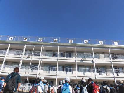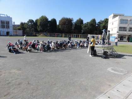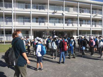 晴天の秋晴れのもと、4年生が遠足に出発しました。みんなのワクワクした気持ちが伝わってくるような笑顔でした。