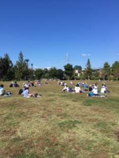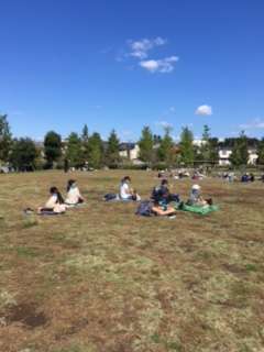 お楽しみのお弁当。たくさん遊んだのでお腹がすいたことでしょう。おいしそうに食べています。みんな元気です。