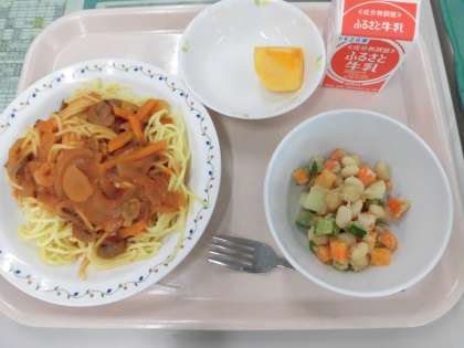地中海スパゲティ、ビーンズサラダ、くだもの(柿)